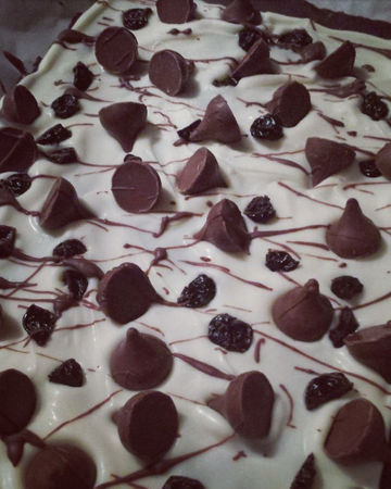 Drop dried cherries and Cherry Cordial Hershey's Kisses across the white chocolate, pressing into the warm chocolate.